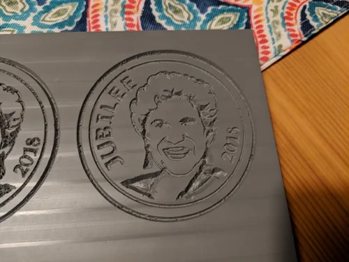 Next, I set up the engraving in Fusion 360 CAM and machined it with a v-bit on extruded plexiglass. I drilled tiny holes in every depression to allow air to escape during vacuum forming. Using a dental vacuum former, I created five flexible molds for casting the chocolate medals from the plexiglass buck.